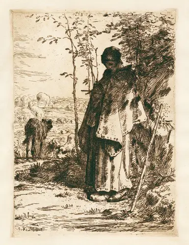 ミレーは、1847年頃、著名な版画家シャルル・ジャックとの出会いから版画を始める。ミレーは感動した題材を描くのに、油彩画だけで満足できずに、パステルやデッサン、そして版画など様々な技法で繰り返し試みている。この版画も1848年から1952年の間に同構図の油絵が描かれているが、デッサン、油絵、版画の三者を見比べると興味深いものがある。特にデッサンの肉太な輪郭線とエッチングのか細い針の跡との比較は、素材と技法に通じたミレーの熟練度の高さを示してくれるであろう。