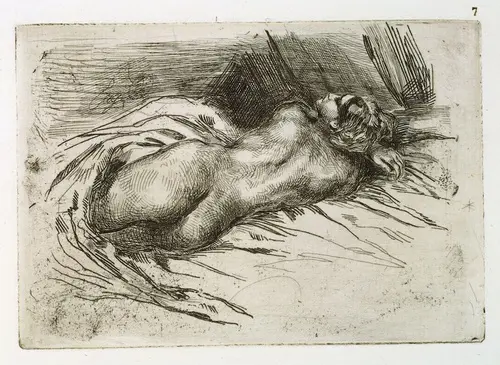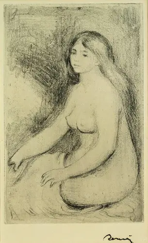 この版画のもととなるデッサンは1881年に描かれ、同じ年に同構図の油彩画《水浴する女》(スターリング&フランシーヌ・クラーク美術研究所蔵)が描かれた。翌1882年にも同じ構図の作品(個人蔵)が描かれていて、ルノワールお気に入りのモデルであったことがわかる。それもそのはずで、彼女は1885年に妻となるアリーヌ・シャリゴであった。甘美な表情、長い髪、そしてふくよかな肢体をもつ婦人の表現は、いかにもルノワール的である。