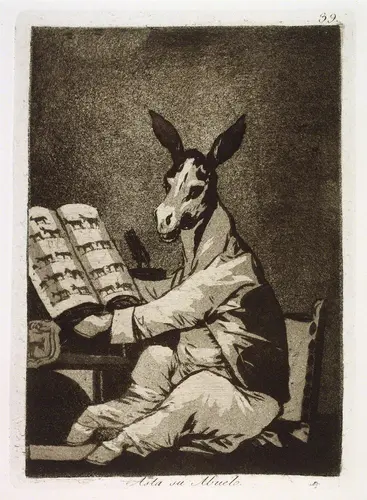 プラド美術館に残る当時の注釈書には「この憐れな動物は、家系図学者や紋章官のおかげで気が狂ってしまっている。彼だけではない。」とある。ここではロバが家系図を見せながら、先祖までずっとロバであったことを誇らしげに示している。机にはロバ家の紋章も見える。貴族の血統に対するゴヤの皮肉や嘲笑が見てとれる。