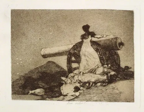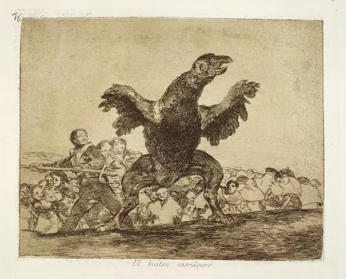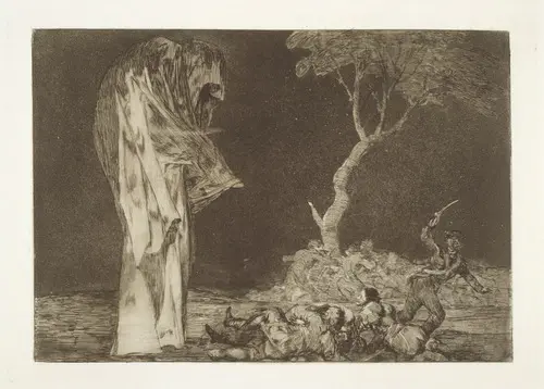 《恐れる者にとっては、影も恐怖である》との諺が付されている。漆黒の夜空にぬっと立つ、得体の知れない巨大な化け物と、おびえる兵士たちの群れ。不可解な“影”のようなものを盲目的に恐れる人間の愚かさが描かれる。兵士を描くのは、対仏独立戦争の忌まわしい記憶によるものであろう。