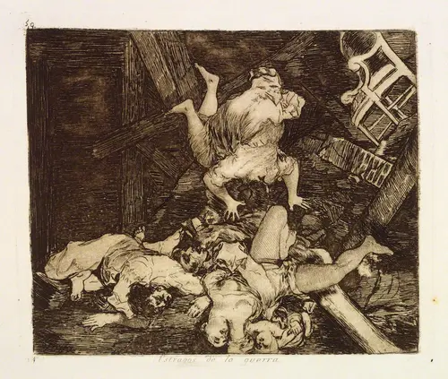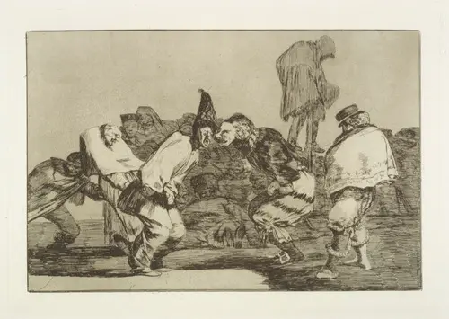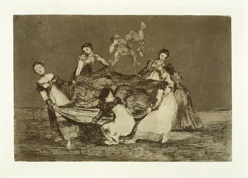 《操り人形と遊ぶのは驢馬たちである》。この諺がこの作品にどの程度関係があるのかわからないが、難解で順番も不明な「妄」を初めて世に出した美術アカデミーは、当時のスペインの諺を作品に添えた。女たちが布を広げ、その上では男(人形?)たちがはね上げられ驢馬と男が横たわる。女たちの蔑むような笑い顔にゴヤの女性に対する辛辣な皮肉がこもっているようだ。右端に「Goya」のサインがある。