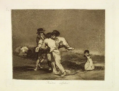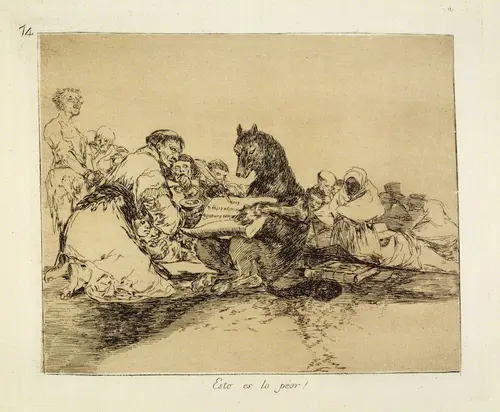 その後の彼は、社会の矛盾に対する批判的精神を込めた《気まぐれ》、残虐な戦争における非人間性を告発した《戦争の惨禍》、猛牛と人間の生命を賭したぶつかり合いを描いた《闘牛技》、人間の内面の不条理を表現した《妄》など、版画史に残る傑作の数々を世に送り出したのです。