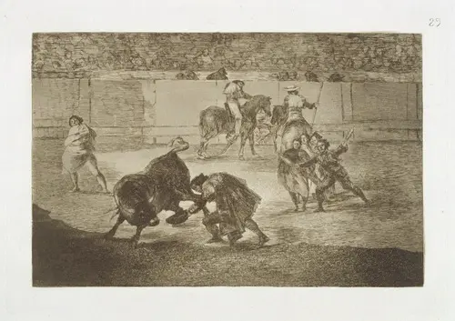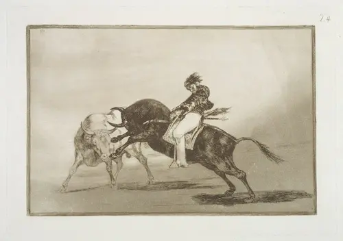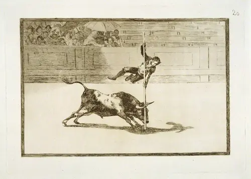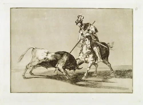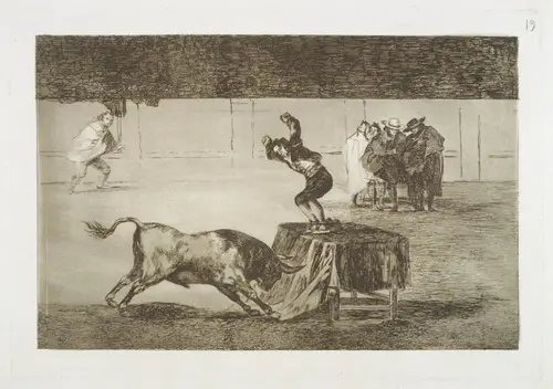 アビニャーニは1750〜70年にかけて活躍し、敏捷な技で名をなした闘牛士。くっきりとした線で明快な効果を持つ闘牛士と牛に対し、後方の観客席はやや弱い線で描かれ、空気遠近法的な手法が駆使されている。軽業のような跳躍に対し、牡牛は攻撃目標を闘牛士を支える跳躍の棒に替えている。明るい地面を背景に筋肉質の牡牛の黒い姿態が重厚な存在感をもって迫ってくるのに対し、闘牛士のはなれ技はいとも軽やかである。