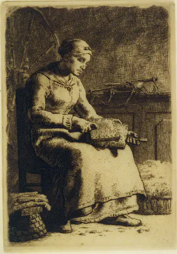 ミレーの室内を描いた油彩画は独特のほの暗さをもっているが、その暗さがコントラストを強くしてこの版画に再現されている。うなだれるように作業をする農婦はたくましく肉付けされ、単調な手仕事をこなしながらも強く生きる様子を伝えている。後年、ミレーはこの構図をもとに油絵を制作したが(1863年サロン出品)そこでの農婦は楽しげに作業に熱中しており、エッチングの農婦の疲れた表情と対照的で興味深い。