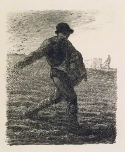1850年のサロン出品後、《種をまく人》は美術界に少なからぬインパクトを与えた。当時の最も重要な芸術誌『アルティスト』がその複製制作を申し出た事もその余波の一つである。その頃のミレーは版画について殆ど素人だったが、銅版画よりも素描をそのまま生かせるリトグラフを選んだ事は賢明であったといえるだろう。それにもかかわらずミレーは試し刷りに不満で、結局この作品は掲載されずに終わった。