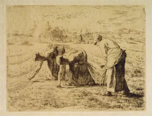 ミレーの版画が絵画に先行している代表的な例である。ルーヴル美術館の油絵は1857年のサロンに出品されており、ほぼ1年前にはその完璧な構図がここに仕上がっていた。背景の細部は油絵とは若干異なり、エッチングの方が地平線の手前寄りに収穫風景を配置しているので、手前の3人との関係は比較的緊密であり、油絵が持つ3人の疎外感は弱められている。また中央の女はエッチングでは腕抜きをまだはめておらず、構図上のアクセントが一つ欠けたようで物足りなさを感じさせ、興味深い点である。