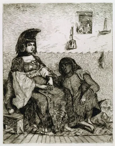 ドラクロワは、1832年前半の北アフリカ旅行から戻った翌年、エッチングの制作に再びとり組んだ。本作は《オランのアラブ人》とともに、その中で最も重要な作品である。ドラクロワはモロッコのタンジールに滞在したおり、ユダヤ女性たちの姿を詳細な水彩画に描き、それらが本作の源泉となっている(タイトルの「アルジェの」は誤称ということになる)。裕福な花嫁が召使いをともない、室内で椅子に掛けている。敷物においた彼女の裸足の形式張らない姿と、重たそうな衣装や威厳のある態度との対比が面白い。