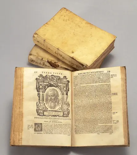 そのデューラーから大きな影響を受けた画家に、マルカントニオ・ライモンディ(1475頃-1519頃活動)がいます。デューラーの版画を研究した彼は、のちにラファエロの素描に基づいた版画を多数制作し、ラファエロ様式がヨーロッパに広がる一助となりました。16世紀にジョルジョ・ヴァザーリが書いた芸術家の伝記『画家・彫刻家・建築家列伝』に、彼の名前と肖像を見ることができます。