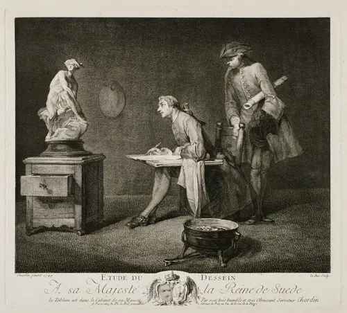 1753年のサロン出品作。緻密なマティエール、絵具の光沢、落ち着いた中間色の色調、影の部分にも感じられるような繊細な光の表現、思索的で重厚な人物のたたずまい、室内の静謐で瞑想的な空気など、シャルダンらしい魅力にあふれる小品。彼の約40年間にわたる作画活動は3つの時代に区分されるが、その中間期にあたる時代が「風俗画の時代」(1730年代から1750年代初め)である。シャルダンの「静物画」は、華麗で女性的な優美さを好んだ宮廷では人気がなく、一部の目利きや画家、収集家に支持されるのみであったが、この「風俗画」の顧客層には外国の有力な諸侯も名を連ねるようになった。この時期の最も代表的な作品としては、《独楽を回す少年》《食前の祈り》(ともにルーヴル美術館蔵)などがある。シャルダンは、スウェーデンのルイーズ・ウルリック王妃のために1749年、《デッサンの勉強》と《良き教育》の2点を贈った。このうち先に完成したのは《デッサンの勉強》の方で、1748年のサロンに出品された。その数年後、彼は再びこの1対の絵と同じ構図をもつ2対目のヴァリエーションを描いている。こちらの2点は、著名な収集家アンジュ=ローラン・ラ・リヴ・ド・ジュリのために制作され、1753年のサロンに出品されたが、このうちの1枚が本作である。本作は、1770年の競売でリヴ・ド・ジュリの許を離れ、あるスウェーデン人の手に渡った。以来その末裔によって長らく秘蔵されていたが、1979年の大規模な〈シャルダン展〉に出品され、人々の前に再び姿を現わしたのである。このとき、対をなす《デッサンの勉強》と《良き教育》の額縁には非常に珍しい特徴があった。作者の名前である〈シャルダン〉の文字が、明らかに18世紀のものと分かる黒く美しい書体で記されていたのである。今日、世界の美術館で行われているような「額縁に作者名のプレートを付ける」というような習慣は当時なかったので、最初の所有者であったリヴ・ド・ジュリが施したこのような処置は、博物館学的にみても先駆的な作業であったと評価される。なお、この秘蔵コレクションの中に含まれていた本作と対をなす《良き教育》の方は、現在テキサスのヒューストン美術館に収蔵されている。