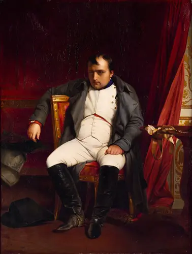 《フォンテーヌブローのナポレオン、1814年3月31日》は、ポール・ドラローシュがナポレオンを題材に描いた二番目の作品になる。第一作の《書斎のナポレオン》が、イギリスの老貴族婦人サンドウィッチ伯爵夫人からの注文制作であったように、この作品もライプツィヒでフランスの絹製品を扱う商人であったアドルフ・ハインリヒ・シュレター(Adolf Heinrich Schletter, 1793-1853)から依頼された。シュレターの注文の背景は未詳だが、かれは美術のコレクターでもあって、80点の絵画と17点の彫刻をライプツィヒ市に遺贈し、この作品は現在ライプツィヒ造型美術館に収蔵されている。つまり原作はいまライプツィヒにある。原作に基づいてドラローシュがすこし縮小して模写した作品がパリの軍事美術館にあり、本作はナポレオン人気にあやかってかれと工房が手掛けた模写のひとつといえよう。パリの軍事美術館の作品は縦横がそれぞれ181センチメートルと137センチメートルであるから、本作はその半分より小さいということになるが、出来栄えはなかなかに見事である。サンドウィッチ伯爵夫人の注文した《書斎のナポレオン》は、原作の所在地はいまわからないが、それに基づくアリスチド・ルイの版画は、ロンドンの大英博物館に残る。それを見ると、ダヴィッドがイギリスのナポレオン讃美者ハミルトン卿の注文を1811年に受けて翌年に完成させた《チュイルリー宮殿の書斎のナポレオン》(1954年にサミュエル・クレスが購入しワシントンのナショナル・ギャラリーが所蔵)を手本にしていることはまちがいない。短くなったろうそくの下、朝の4時過ぎまで仕事をする、近衛騎兵隊の制服をまとって勲章を付けた、やや身体を画面左手に向けた精悍な姿が描写される。1812年末、ナポレオンはロシア遠征に失敗して凋落が始まるが、その前の覇気に満ちた皇帝像といえよう。伯爵夫人は縁故から制服やサーベルや煙草入れなど、ナポレオンが着用したものを借りて、画家を助けた。全身像と半身像、舞台装置など異動する点があるのは確かだが、繰り返しになるが、ドラローシュがダヴィッドの作品を参照したことはまちがいない。さて、《フォンテーヌブローのナポレオン、1814年3月31日》は、同盟軍がパリに入場した3月31日、フォンテーヌブロー宮殿の小アパルトマンに逃れてきた皇帝を描く。憔悴し怒っているようにも見えるのは、かれの置かれた状況を反映している。土埃が付着したままの靴、床に投げ出された帽子、ソファの上に無造作に置かれた書類カバン、円卓の上のサーベル、これらが皇帝の表情や仕草とともに苦境を明示する。肥満した老齢の皇帝は、かつての精悍な風貌からは程遠い。シュレターがなぜ苦境の皇帝像を注文したかはわからない。パリの軍事美術館のカタログによれば、作品の制作年は1840年である。しかるに1999年から2000年にナントとモンペリエで行われた『ポール・ドラローシュ、歴史の中の画家』展では、ケント大学のシュテファン・バンはシェルターへの支払いの記録が1845年であることを手掛かりのひとつとして、1845年の制作としている。支払いの期日と制作年を同一と考えることは問題があるが、画家は栄光の英雄ではなく不幸な英雄、殉教のイメージの創造に腐心したとする。妻がこの年の12月に亡くなるなど、妻の容態などの身辺の事情もその判定に与っているようである。ただ、画家は制作上の挫折などはこの時期は無縁だったように感じられる。この作品をロダンの《考える人》の祖型と指摘したドイツの美術史家ヴェルナー・ホフマンの見解があることを加えておきたい。造型の特徴とともに、絵画の将来に心を砕いたドラローシュの心情を、それはくみ取っての卓見といえよう。この工房作は、明暗のコントラストなど原作より強調され、皇帝の置かれた苦境をより強烈に表現する。ドラローシュとアカデミスムの画家たちの確とした技量を証しする作品といえよう。