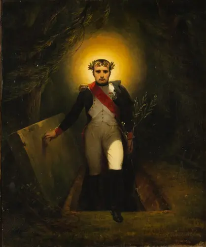 デミドフ旧蔵のオラース・ヴェルネ自筆の貴重な作品である。1840年12月15日、100万人もの人が見守るなか、雪に覆われたパリをナポレオンの遺骸は凱旋してアンヴァリッドに到着した。1815年にセント=ヘレナ島に幽閉されて1821年5月5日に亡くなったナポレオンは、3重の棺に納められて厳重に密閉されていた。遺骸の発掘は25年前に島に着いたのと同じ10月に、豪雨のなか松明の火の下で行われた。7月革命で誕生したオルレアン家のルイ・フィリップのもとで、フランスはコレラの流行や労働者の蜂起など政治的・社会的に不安定な状況に置かれていた。そうした社会でナポレオンは美化されて、愛国的で実際より左翼的なイメージが流布されていったが、それをジャーナリスト出身の政権を狙う政治家アドルフ・チエール(1797-1877)は利用しようとした。イギリスと交渉して、遺骸の返還にこぎつけたのである。フランス海軍フランソワ・ドルレアン提督が率いる戦艦「ベル・プール(美しい雌鶏)号」で移送された遺骸を、ルイ・フィリップはアンヴァリッドのドーム聖堂の地下に安置することにした。「私の愛するフランス国民に囲まれて、セーヌの岸辺に眠りたい」というナポレオンの遺言は、かくして実現した。ナポレオンの讃美者であったオラース・ヴェルネは、画中右下の年記によれば1840年にこの作品を描いた。注文主はナポレオンの崇拝者であったアナトール・ニコラエヴィッチ・デミドフ(Anatole Nikolaïevitch Demidoff、1812-1870)である。かれは実業家で外交官であり芸術庇護者であった父ニコラ(Nicola Demidoff、1773-1828)がフィレンツェの北西に位置するポルヴェローザに、カトリック教会から購入した広大な敷地に建てたヴィラ・サン・ドナートを相続した。アナトールもドラクロワやジェリコー、ボーニントンなどに作品を注文するなど、芸術愛好家であった。1839年にはフィレンツェのヴィラ・ディ・カルトに亡命していたナポレオンの末弟で前ヴェストファーレン王国国王ジェローム・ボナパルトに紹介され、翌年にはジェロームの長女マチルド・ボナパルト(1820-1904)と結婚した。ナポレオン崇拝者のアナトールとジェローム・ボナパルトとの出会いがヴェルネの制作の始点となっていることはまちがいないが、ナポレオンの遺骸の返還と関係するかは未詳である。さりながら、ナポレオン礼讃の根強さ根深さの貴重な証左として、記念すべき作品といえよう。これは1870年のデミドフ・コレクションの売立てのカタログに掲載されている。闇夜のなか、柳の木が覆いかぶさる墓所の石の蓋をナポレオンが右手で開けて、オリーヴの枝を左手に持ち階段を上がってくる姿が表わされる。レジオン・ドヌール勲章が胸を飾り、赤い綬をかけたナポレオンの頭部を輝かしい光が照らす。この図像が「キリストの復活」のイメージを踏まえていることは言うまでもない。4つの福音書は、アリマタヤのヨセフがキリストの遺体を墓に納めたが、安息日の翌日に行くと墓の上に置かれた石が取りのけられ、天使がキリストの復活を告げたことを、異同はあるものの記している。たとえばピエロ・デッラ・フランチェスカの《キリストの復活》(サンセポルクロ市立美術館)は、この聖書の記述から画家が想像の翼を広げて創造した作品であり、その後のキリストの復活図のいわば祖型となった。ヴェルネは主の復活にナポレオンの帰還を重ねて、この作品を制作したのである。ナポレオンの頭部にさす光は、まさにニンブスといえよう。ヴェルネの作品はジャン=ピエール=マリ・ジャゼ(1788-1871)が、着色アクアチントで複製しており広く流布することになった。