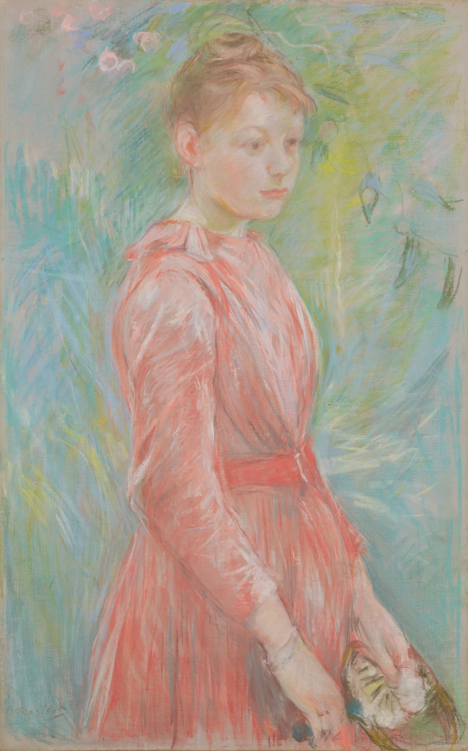 なだらかな肩と豊かな曲線のシルエットを包む鮮やかな色彩。乙女の初々しい表情が印象派風のタッチで的確にとらえられている。ベルト・モリゾは、子どもの頃からデッサンのレッスンを受け、1861年からコローの指導のもとに戸外で絵を描いた。後にマネと知り合い指導を受けることになる。印象派の展覧会に7回出品。繊細な感性と甘美な色彩感覚に優れたこの作品も彼女の代表的なパステル画の名品の一つである。