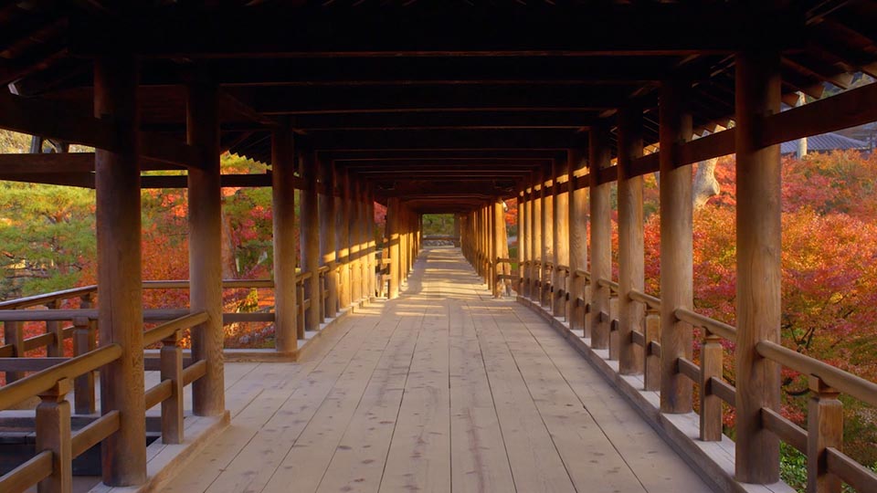 東福寺は、京都最大の禅宗寺院です。広大な境内には東福寺三名橋とよばれる3つの橋があり、そのうち通天橋は、京都を代表する紅葉の名所として知られています。 東福寺は、鎌倉時代に摂政・関白をつとめた九条道家(1193-1252)が、臨済宗(禅宗の一派)の僧、円爾(1202-1280)をむかえて創建した寺です。東福寺という名前は、奈良の東大寺と興福寺から「東」と「福」の二字をとって名づけられました。 何度も火災にみまわれましたが、そのたびに豊臣秀吉(1537-1598)や徳川家康(1542-1616)など、時の権力者によって再建されました。境内には、国宝の三門をはじめとして、日本最大にして最古の坐禅道場である禅堂、日本最古のトイレの東司、蒸し風呂形式の浴室など多くの文化財があります。 また、住職の住居である方丈の東西南北には、作庭家の重森三玲(1896-1975)が手がけた庭園があります。枯山水の南庭、北斗七星を表現した東庭、大市松模様の西庭、小市松模様の北庭からなる4つの庭園で、京都が世界にほこる名庭といわれています。