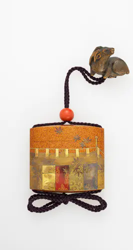 <p>印籠は、薬を入れて腰に提げる小さな容器。江戸時代中頃以降は実用品というより、アクセサリーとして用いられることが多かった。<br />根付は、印籠や煙草入・巾着などを腰に下げるためのホルダー。印籠・根付はつける人の趣味を表わす格好の装身具であり、形や意匠にさまざまな趣向が凝らされている。<br />(2004/09/01_h101 or 2006/08/29_h101)<br /></p>