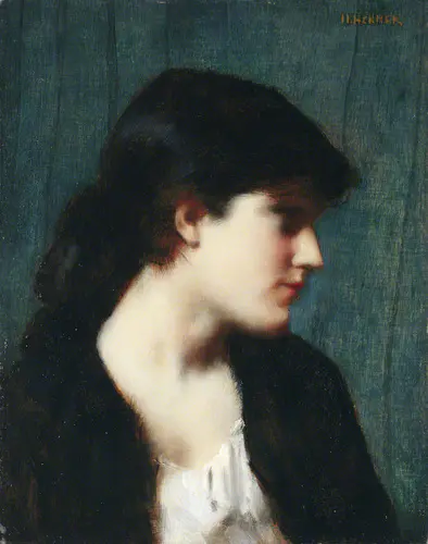 エンネルは1864年から神話画、肖像画を中心にサロンへ作品を発表していくが、1870年の普仏戦争によって故郷アルザスがドイツに占領されると、翌年に《アルザス》(国立ジャン=ジャック・エンネル美術館蔵)を発表し、その後は「マグダラのマリア」や「死せるキリスト」のような死をテーマとした作品を連続して発表していく。また同じく作風もアカデミックで明快な写実描写から輪郭線をぼかし明暗の対比を意識した描法(キアロスクーロ)へと転じていった。1879年、《墓の中のキリスト》(オルセー美術館蔵)とともにサロンに出品した《牧歌》(パリ市立プティ・パレ美術館蔵)にはその特徴がよく現れている。本作も女性の髪、目元の影、上着に見られる黒と、女性の肌、中に着ている服の白とが強いコントラストで描かれている。輪郭線が判然としないこのような女性像は、エンネルの晩年の特徴をよく表している。こうした輪郭線の描写には、エンネルが若い頃に目にし、影響を受けたイタリア絵画に使用されていたスフマート技法が生かされている。また、エンネルは最晩年に至るまで、本作に見られるような小さな画面の肖像画を、板やカンヴァス、ボードを用いて数多く残している。