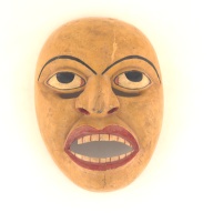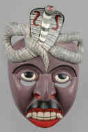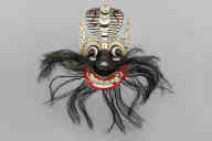 アイヌは身のまわりにある自然から得られた様々な素材を巧みに利用し、日々の生活に用いていました。例えば美しい刺繍のパッチワークが施された樹皮製の衣服「アットゥシ」や、見事な彫刻が施されたた木製のお盆は、その代表です。 アイヌはそのほかにも、ガラスや金属など、自分たちでは作らなかった素材や製品を、周辺民族や和人(わじん)との交易によって手に入れていました。アイヌ自らが作った道具と共に、ガラスや金属で作られた道具を、自分たちの暮らしに役立てていたのです。 この作品は、アイヌが和人から手に入れたもののひとつで、本州で用いられた、兜の前に立てる飾りである「鍬形」(くわがた)を模したものです。全体を鉄で作り、銀の金具で装飾を施しています。こうした鍬形は、アイヌ語では「ぺラウシトムカムイ」つまり「箆(へら)をお持ちになっている宝の神さま」、あるいは「キラウシトミカムイ」つまり「角(つの)をお持ちになっている宝の神さま」とも呼ばれています。病人の枕元におくことで病気を治し、災いを払うなどの霊力をもつ宝物として用いられました。 アイヌの宝物の中でも特に重要とされた鍬形は、集落の有力者が用いるものとされていました。家に置いておくと祟(たた)りをもたらすため、普段は山の洞窟に隠しておかれたり、地中深くに埋められたりしました。そのため、伝世品として現在に受け継がれている例はなく、現在知られているものは全て、偶然に発見されたものです。この作品も大正5年1916年に、北海道栗山町(くりやまちょう)の畑地の開墾中に、重なって発見された7点の鍬形の一つです。(東京国立博物館)