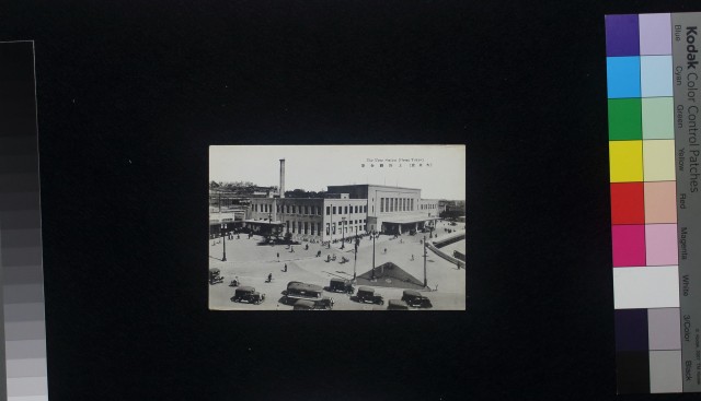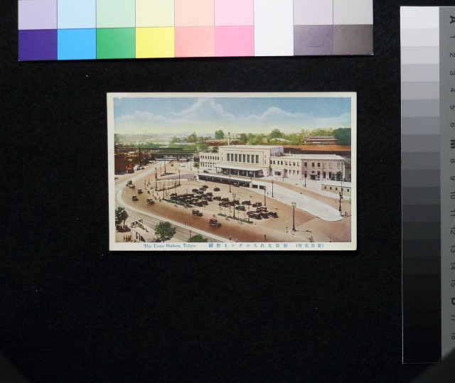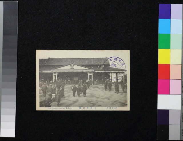 この絵はがきは昭和7年(1932)に完成した2代目の上野駅駅舎。コンコースには自動車が横付けできるようなスロープが設けられている。乗車口と降車口を上下に分け、車の平面交差を避けることで広場に地下道を設け、車と人の分離を図っていた。