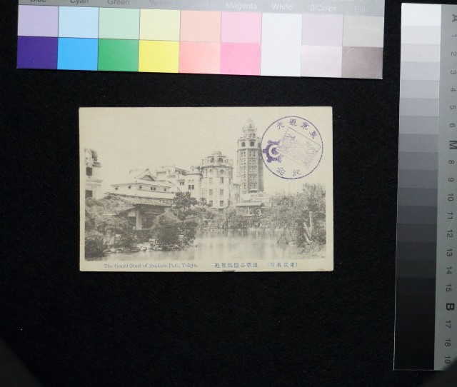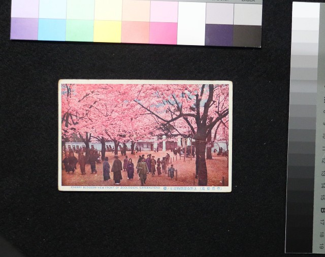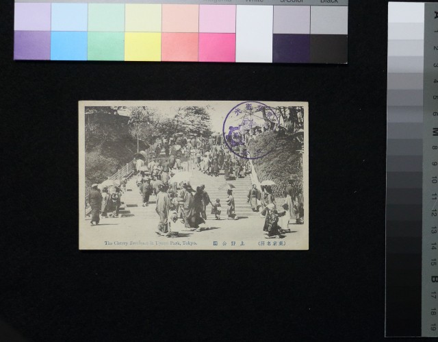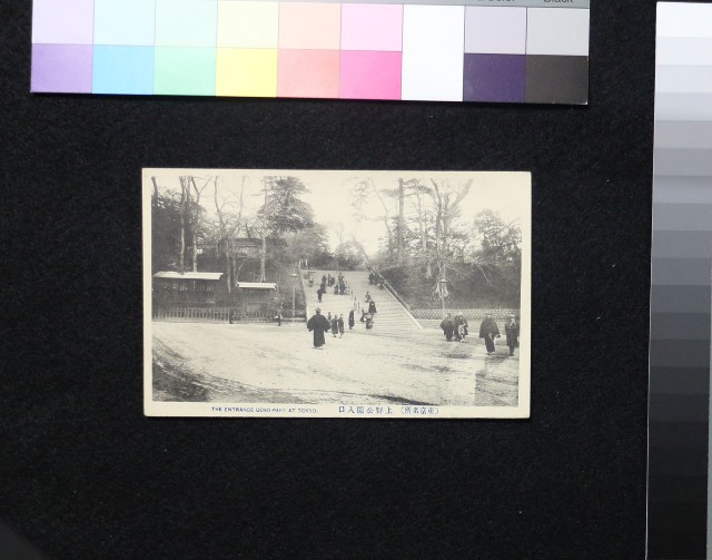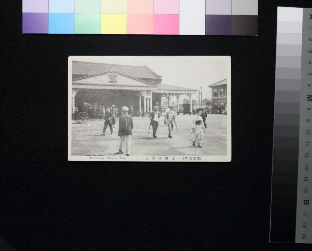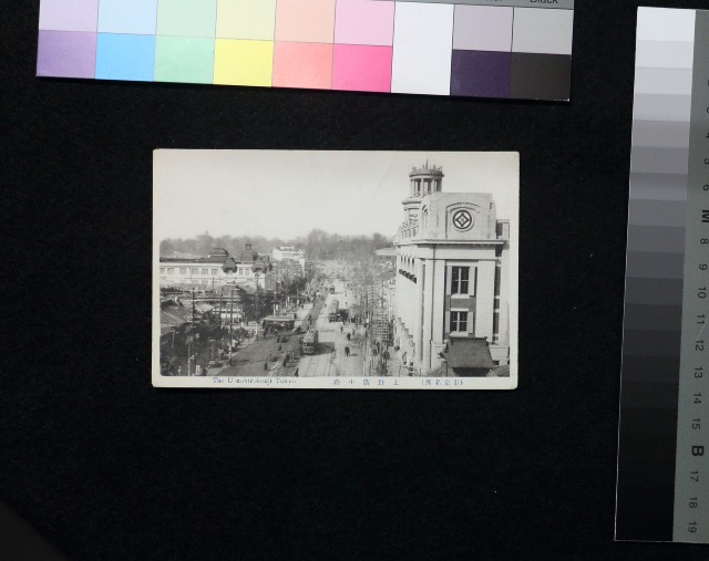 現在の上野広小路交差点付近から上野公園方向へと眺めている上野広小路の風景の絵はがきである。絵葉書の広小路の両端を見てみると、様々な店が並び大勢の人々が通行している様子が見られる。寛永寺の御成道として発達してから、現在に至るまで栄えている大きな道だと分かる。