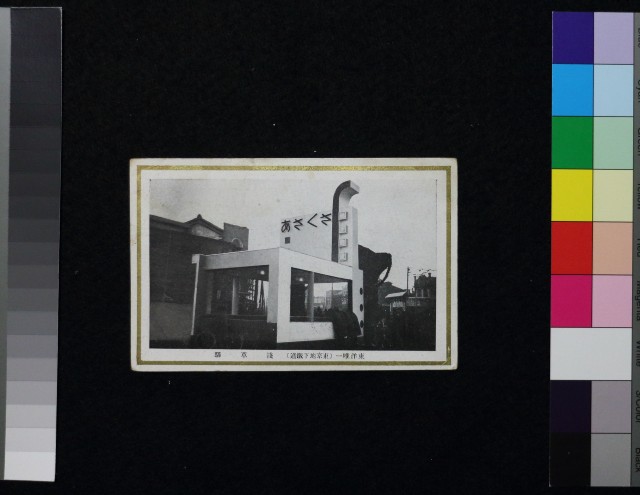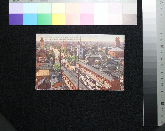 「浅草仲見世」:現在の雷門の位置から蔵前方面を眺めたもの。雷門は慶応元年(1865)に焼失し、その後、仮設で短期間の門が数度建てられたが、昭和35年(1960)に松下幸之助から寄進されるまで、正式には再建されなかった。仲見世が煉瓦造りであることから、関東大震災前と推察される。