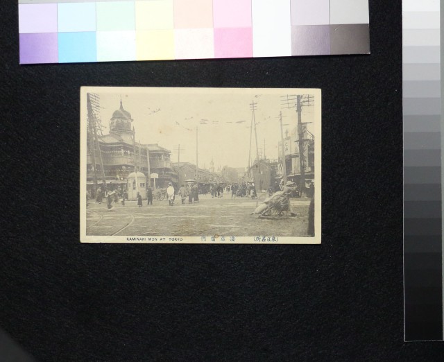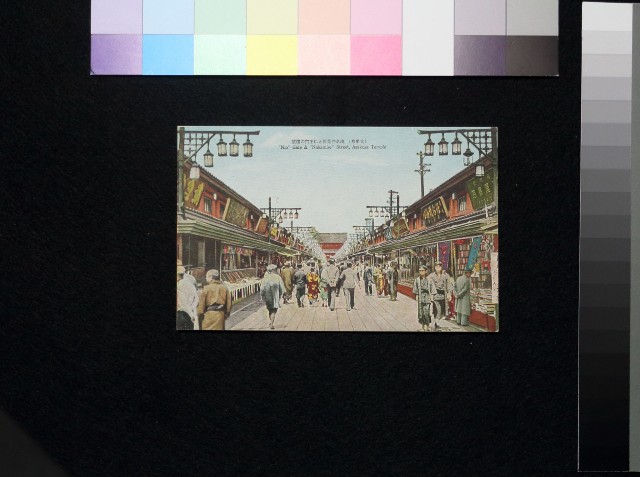タイトルに「浅草雷門」とあるが、門がない時代の絵はがきである。大八車、赤レンガ造の仲見世など、明治の面影が見られる。赤レンガは、関東大震災によって崩壊したので、年代はこれ以前までと推定できる。