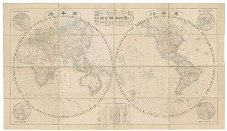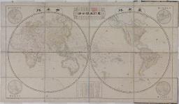 幕府暦局による東西両半球世界図。これより先、文化13年[1816]刊(推定)の、同じく暦官(天文方)であった高橋景保による「新訂万国全図」があり、約40年を経てその内容の改定が必要とされた。投影図法、副図を含む図の形式は旧図にならうが、1846年刊ゼルマニア(ドイツ)人ソルおよびハンドトゲの合作図を原拠とし、その他欧州諸図も参訂して、天文方山路諧孝の指揮下、その嫡男彰常と佐渡出身の地理学者柴田収蔵が改訂にあたった。例言に編集の次第を述べる。例言中、約100年前とする旧図(新訂…)の原拠図の年代については、今日の研究により、実際には18世紀末(約50年前)のものであることが知られている。旧図は銅版刷だが、本図は精細な木版、「合作図」にならって国境線に彩色を施す。