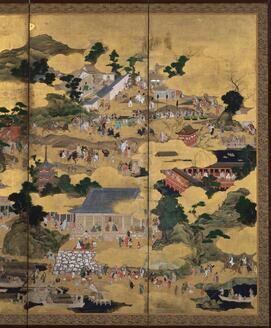 時宗の開祖、一遍の諸国教化行脚(あんぎゃ)を描いた絵巻物。聖戒(しょうかい)が編纂した『一遍聖絵』と、宗俊(そうしゅん)編纂による『一遍上人縁起』(『遊行上人伝絵』とも)の2系統がある。聖戒が詞書(ことばがき)を書き、法眼(ほうげん)の円伊(えんい)が絵を描いた清浄光(しょうじょうこう)寺蔵(一部は東京国立博物館蔵)の12巻本(国宝)は、正安元年(1299)の成立。宋画の描法を取り入れた大和絵で、当時の生活・風俗を知る資料としても貴重。一遍(1239-1289)は伊予国(いよのくに)(愛媛県)の豪族河野氏の出身。10歳で出家、建長3年(1251)大宰府に行き、聖達(しょうたつ)に師事して浄土宗の教学を学ぶ。その間、智真(ちしん)と名を改めたが、弘長3年(1263)父の死により伊予に戻り還俗した。のち再び出家、文永8年(1271)信濃善光寺に参籠したとき、独自の阿弥陀信仰を感得した。同11年に遊行(ゆぎょう)の旅に出、以後正応2年(1289)に往生するまで、名号の札を配り(賦算[ふさん])、奥州江刺(えさし)から大隅国(おおすみのくに)に至る全国を遊行した。熊野三山のうち本宮の証誠(しょうじょう)殿に参籠した際、「熊野権現の神勅」によって、いっさいを捨て阿弥陀如来に任せるという立場を確立したといい、智真から一遍に改名。弘安2年(1279)空也(くうや)にならって信濃国小田切の里(長野県佐久市)で催した踊念仏(おどりねんぶつ)が人気を集め、以後一遍の赴くところで行われるようになった。『一遍上人絵伝』には、当時の町や市、人びとの暮らしが描かれ、貴族・武士から庶民までさまざまな階層の人びとが登場する。