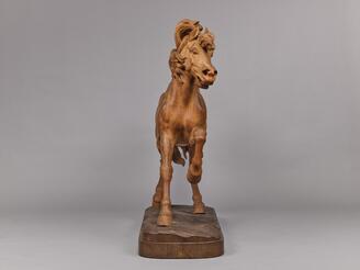 <p>後藤貞行は軍馬局に勤めながら彫刻を学び、明治天皇所有の馬である金華山号の彫刻を制作した。明治23年(1890)には東京美術学校に転じ、高村光雲(たかむらこううん)による監督のもと、皇居前に建つ楠木正成(くすのきまさしげ)銅像の馬の原型制作たずさわった。写実を徹底するため馬の解剖も行なったという。</p>