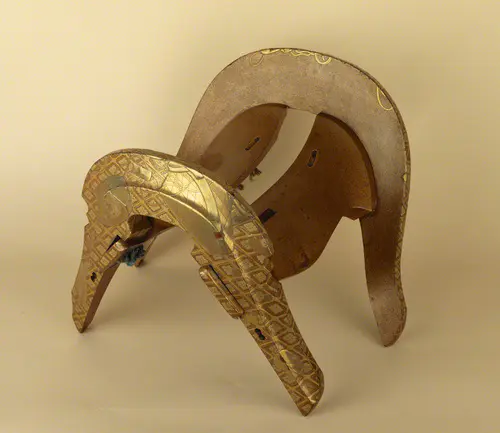 <p>馬装の装飾化は、轡(くつわ)や鞍(くら)、鐙(あぶみ)にとどまらない。馬具を装着するための革帯から垂下する杏葉(ぎょうよう)・馬鐸(ばたく)・馬鈴(ばれい)、革帯の交差部分を留める雲珠(うず)、歩揺(ほよう)付飾金具等は、視覚的、聴覚的に騎乗者の威信を表象した。銅に金鍍金を施した金銅製、白銅色に輝く鋳銅製のものがみられる。<br /></p>