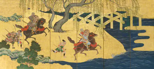 『平家物語』の中の源平合戦の名場面である宇治川先陣争いの場面。宇治川の合戦の先陣を切ろうと先を進む梶原景季に対して後に続く佐々木高綱が馬の腰帯の緩みを指摘し、景季がそれを直そうとする間に高綱が先陣を奪いとるというシーンが描かれる。高綱の素朴な仕草が愛くるしい。代赭の色遣いが印象的で、周囲の添景である緑青による松や柳、群青の海や川の流れに映えて美しい。人物や馬の描写も細部まで丹念に仕上げられている。