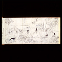 縦37.0×横777.0cm19世紀前期を代表する江戸浮世絵師、初世歌川国貞の筆になる下絵。画題は、歌舞伎のなかでも人気の高い「仮名手本忠臣蔵」である。国貞は別号香蝶楼、師である初世豊国の活躍を引継ぎ、役者絵に秀で一時代を築いた。本資料は巻子仕立てで、大序から十一段目までを10図にまとめ、、それぞれ大判錦絵3枚続き相当の大きさで描く。版をおこす前の肉筆であり、完成前の腹案が知られるのが興味深い。演劇博物館開館にあたり、逍遙と親交のあった江戸文芸の考証家、三村竹清(1876~1953)から寄贈された。