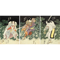 連結図を除き、上から縦38.2×横26.2cm、縦38.3×横26.1cm、縦38.2×横26.0cm大判錦絵。初世国貞は初世豊国の後を継ぎ、19世紀前半に人気を博した絵師。浮世絵史上、現存最多の制作数を誇る。本図は大判3枚続きで、文化12年(1815)11月江戸中村座上演の舞台に取材したもの。5世松本幸四郎(大四郎)、7世市川団十郎(平井保昌)、3世坂東三津五郎(長作)の舞台姿である。この場面には描かれないが3世尾上菊五郎の襲名狂言でもあり、彼を加えた4人の人気役者を源頼光の四天王になぞらえた作品であった。鼻が高かった5世幸四郎は、その特徴を生かして迫力ある横顔が描かれている。