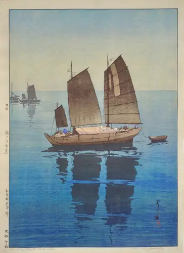 大正11年(1920)、渡邊版画店より出版された《帆船》(3部作)に連なる作品で、「瀬戸内海集1」に収録されたもの。本シリーズ制作の翌年、第8回帝展には《帆船》(4部作)を発表している。日本アルプスなどを描いた山のシリーズと対照をなす水のシリーズの代表作。同じ版木を使い、異なった色を用いて帆船が浮かぶ海の情景を6種の時間帯に分けて描いている。こうした試みを作家自ら「別刷」と称した。