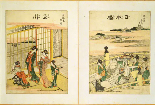 北斎は、その生涯に、確認されているだけでも東海道のシリーズの浮世絵版画を7種類手がけている。この展示の版図はその中の最も大きなサイズのもの。文化7年(1810)、北斎が50歳の時刊行されたものと思われ、版元については「掛川」「見附」などの画中に伊勢屋利兵衛の商標があることから伊勢屋版とされている。十返舎一九の『東海道中膝栗毛』の主人公である弥次郎兵衛、喜多八のような二人の旅人が描かれていたり、宿駅や旅人の風俗を中心に描かれている。