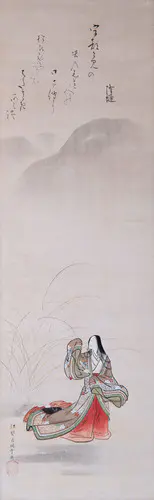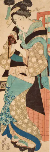 本図のように竪絵2枚の構図の掛物絵は文化年間中期に英山が好んで使用した形状で、一種のブームを呼んだ。女性は遊女であろう。髪を櫛や簪、笄で飾り、豪華な着物をまとい前帯を結んでいる。柱にもたれかかるように身体をくれらせて立ち、口には文の切れ端であろうか紙片を咥え、むさぼるように文に目を通している。英山は着物に多くの菊の図柄を取り入れたことで知られるが、この女性の着物にも菊文様があしらわれている。裾の間から見える何気ない足の仕草が、この女性の心の動きを想像させて楽しい。英山59歳の頃の作。