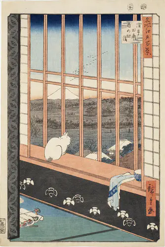 格子の外を見つめる猫の後ろ姿が可愛らしく印象的だが、格子窓のこの部屋は吉原の妓楼の二階であろう。飼い主の遊女は接客中のようで、畳には客が持参したものか、浅草の鷲神社の酉の市土産の熊手型の簪が転がっている。窓の外には浅草の田んぼの向こうに熊手を持って行き交う人々の姿が描かれ、遠く富士山と空高く雁行する雁の群れが見える。空は夕日に赤く染まって、吉原も忙しくなる頃合いである。猫は、縁起物の熊手を買い求める参詣客で賑わう酉の市の喧騒に耳をそばだてているようだ。