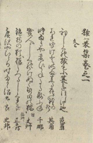俳諧撰集。6冊。重頼編。寛文4年(1664)奥付。発句・付句のほか、俳諧式目歌、貞室に対する論難文、名所付合語集を収める。「(伊賀上野)松尾宗房」の名義で2句が入集し、刊行された書物に見られる芭蕉の作品としてはこの2句が最古となる。掲出はその巻6。「枩尾宗房」の句で、「姥さくら老木をそれと御覧せよ」が載る部分。
