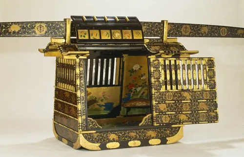 宇和島伊達家の家紋である「竹に雀紋」と「竪三引両紋」が描かれた乗物。駕籠の中でも引き戸が付いている高級なものを乗物と呼ぶ。内装部分には、金地に風景と草花が極彩色で丁寧に描かれている。本作は仙台藩第7代藩主伊達重村の娘順姫が伊予宇和島藩第6代藩主伊達村壽に嫁いだ際に用いられた品と考えられている。大名家にふさわしい豪華な蒔絵、華やかな花鳥画が特徴的である。同種の乗物はわずかしか現存しておらず、文化的にも高い価値がある。