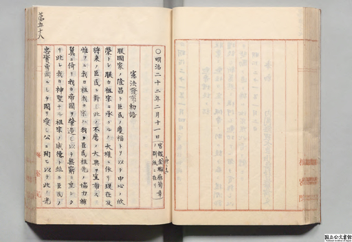 元老院は、国憲取調委員を置き、海外憲法などの調査を行い、明治13年(1880)には、「日本国憲按」と題する憲法草案を奏上しましたが、この案は、我が国の国体に十分適合するものではないとして、成案となるに至りませんでした。憲法制定の本格的な準備は、明治14年(1881)に国会開設の勅諭が発せられたことがきっかけとなって始まります。