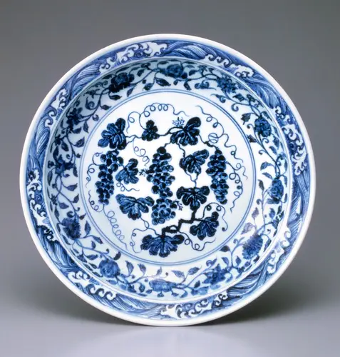 コバルト顔料で絵付けを行う「染付」の技法は、中国では「青花」と呼ばれ、元時代(1271~1368)末頃の江西省・景徳鎮窯で完成したとみられている。当時、用いられたコバルト顔料はイスラム圏産のもので、また、イスラムの金属器を模した器形や文様が多くみられることなどから、中国の青花はイスラム圏からの注文を受け、その影響下で製作が始まったと考えられる。当初は主に輸出用として生産されていたが、明時代(1368~1644)の15世紀初頭には、景徳鎮に設置された官窯で宮廷の御用品として焼造されるようになり、洗練した格調高い様式が完成される。以後、中国を代表する陶磁となり、明・清時代にかけて、アジア、中近東、そしてヨーロッパの国々にまで流布し、世界中の人びとを魅了した。