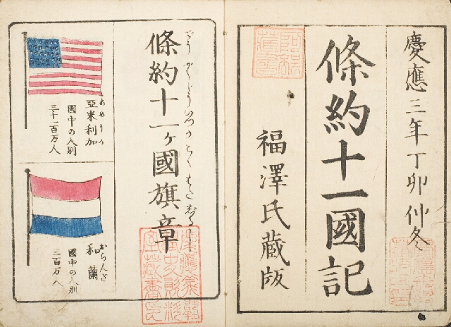 慶応3年(1867)刊。慶応3年までに日本と条約を交換した11ヵ国、アメリカ、オランダ、イギリス、ロシア、フランス、ポルトガル、プロシヤ、スイス、ベルギー、イタリー、デンマーク各国について簡略な紹介をした小冊子。