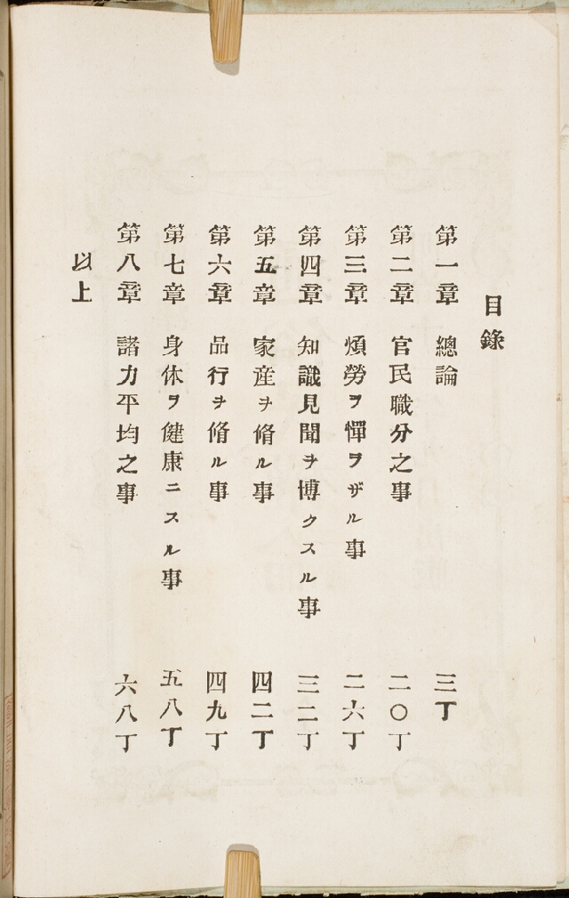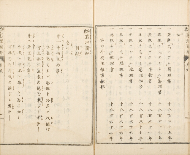 明治元年(1868)刊。物理学の初歩を童蒙にわかり易く説いたもので、当時の小学校教科書などに広く用いられた。画像は目録頁。