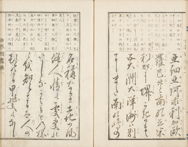 明治2年(1869)刊。習字の手本とすると同時にその文句を諳誦して自然に万国の地理風俗を覚えさせる趣向で著わしたもの。