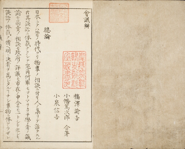 木版小型一冊本。茶色の和紙を表紙とし、左上隅に題箋を貼る。題箋は太罫の枠の中に「会議弁 福沢諭吉/小幡篤次郎/小泉信吉/合著 完」と記す。見返しはなく、本文17丁、それに三田演説会之序、憲法、式日あわせて10丁。奥付、刊記を欠く。