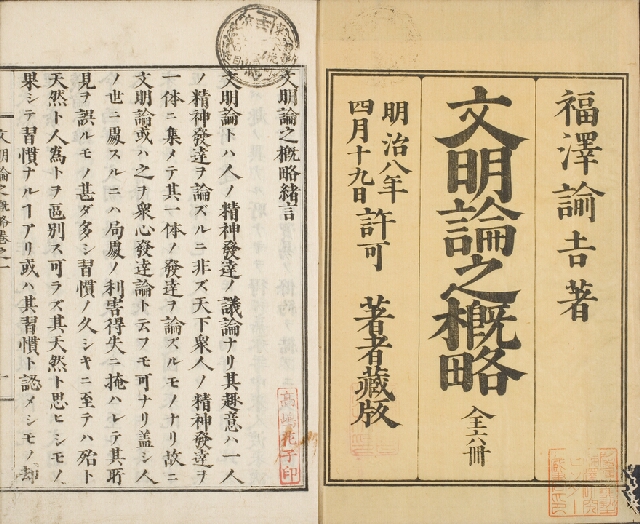 明治8年(1875)刊。福沢の著書中、最も学問的体裁の整った著書で、西洋文明の大要を記して、この文明に向かって進むことが日本の独立を全うする所以を説く。