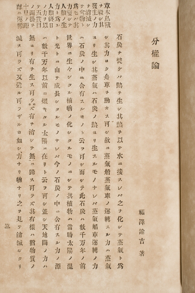 初版は、慶応3年(1867)刊。掲載書はその初版本で、掲載画像は「世ノ文明開化」と題する章の一部。「文明開化」の語の使用例は本書がもっとも古いとされる。