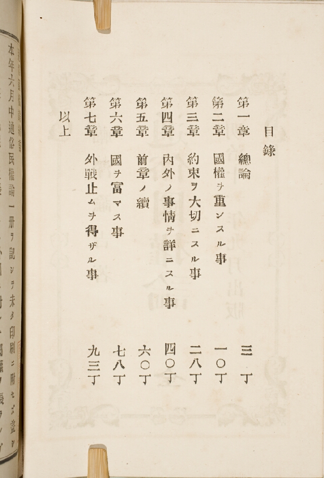 明治11年(1878)刊。初編と二編がある。初編は約1か月で書き上げられた。『通俗民権論』を印刷しないうちに、民権・国権を同時に説くことが大切と考えて国権論を脱稿、両書同時に出版した。国権論の起稿は民権論脱稿の6月18日以後、脱稿はおそらく緒言の末尾に記した7月22日であろう。『通俗民権論』と同じく8月19日に版権免許を得て、9月に単行本として出版された。画像は目録頁。