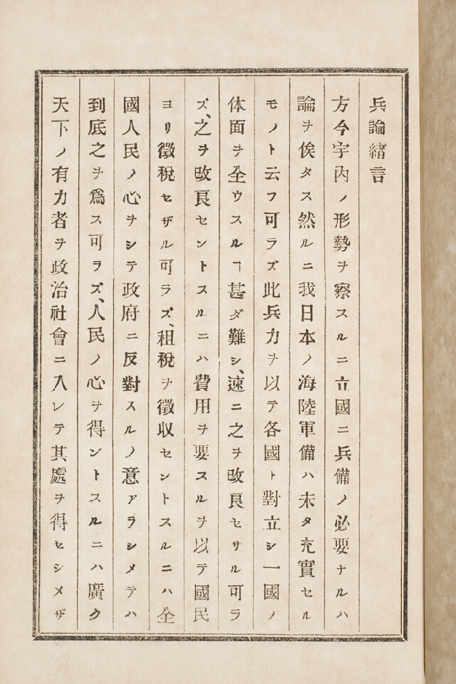 明治15年(1882)刊。軍備充実を中心に、租税増徴、官民調和の必要を述べたもの。画像は「緒言」の頁。