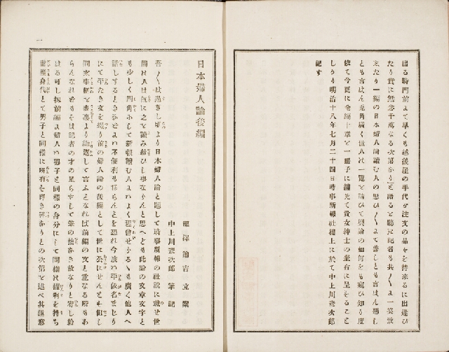 明治21年(1888)刊。「日本婦人論」「品行論」「男女交際論」などの論緒を発展させ、家庭における婦人の地位を向上解放させるのと同時に、男子の横暴不行跡を抑えようとの意図を以て論出したもの。