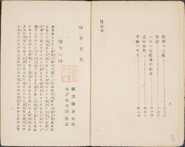 明治11年(1878)4月18日に起稿し、6月18日脱稿、8月19日版権免許、9月に慶応義塾出版社から単行本として刊行された。人民の権利自由について分かりやすく説く目的で著わしたもの。民権と国権を同時に説くことが大切と考え、『通俗国権論』と同時に出版された。画像は目録頁。