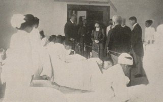 貧民医療を目的に、明治天皇からの恩賜金を基金として恩賜財団済生会が明治44年(1911)に設立されました。渋沢は、多額の寄付を行ったほか、済生会顧問・評議員に就任しました。画像は貞明皇后(大正天皇の皇后)が済生会芝病院に行啓した際の写真。